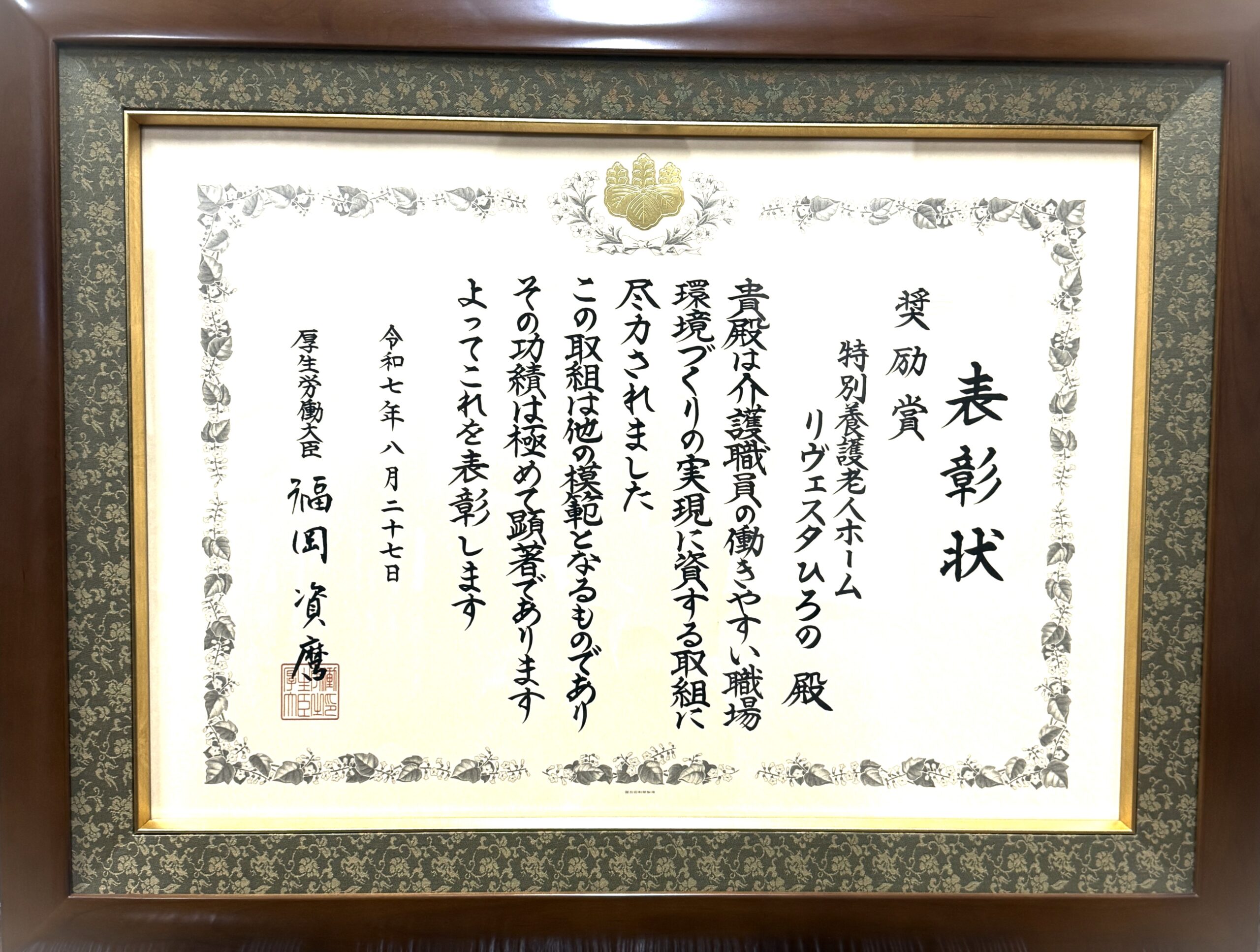 「令和7年度 介護職員の働きやすい職場環境づくり 厚生労働大臣表彰」において、奨励賞 を受賞いたしました。